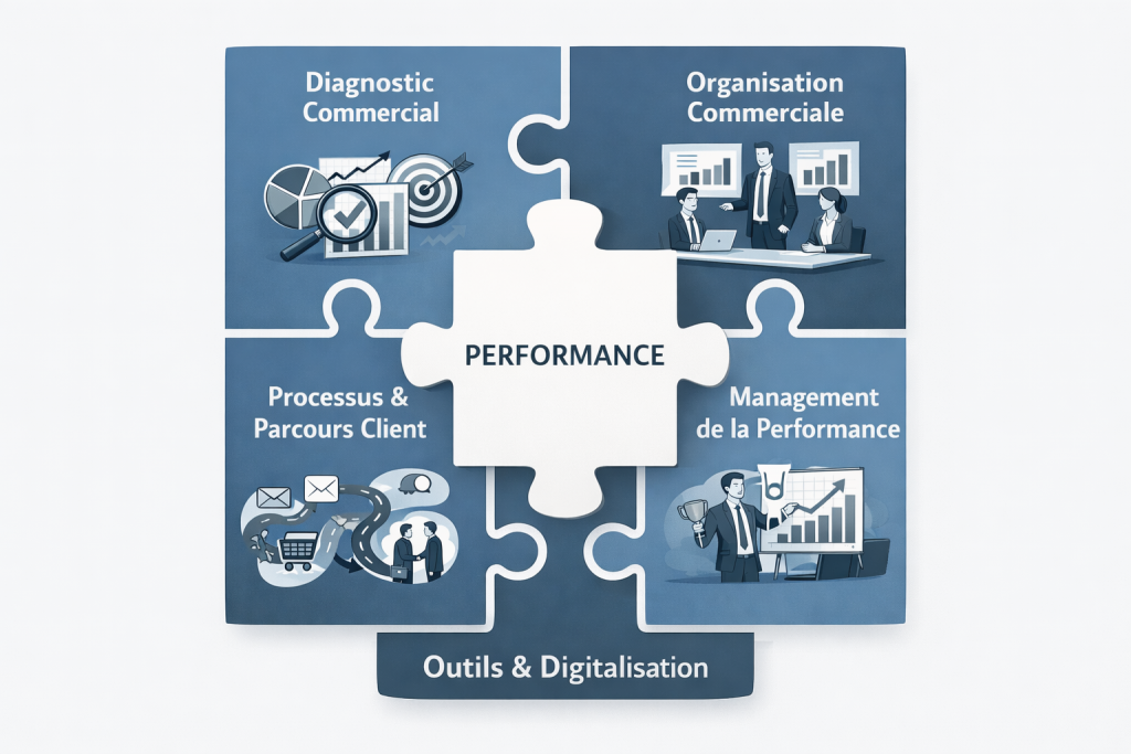 | Organisation commerciale | Gagner en efficacité collective | Rôles et missions, couverture commerciale, coordination ventes/Mkt | CA par secteur, présence commerciale, coûts commerciaux |